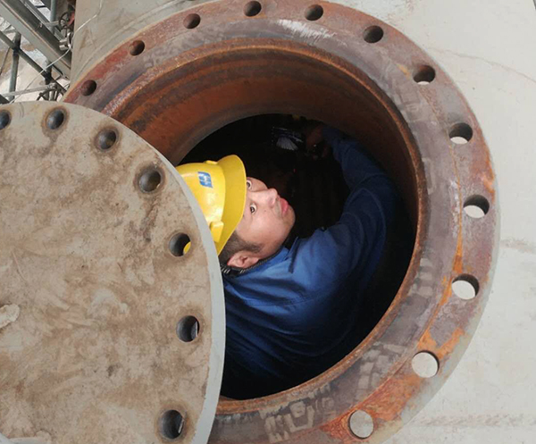 筆者來到現(xiàn)場,正碰見要下到反應(yīng)器內(nèi)的李生虎。長管呼吸器、安全帽,全副武裝的他,一邊用手將第一層的瓷球鋪平,為后面裝填的催化劑提供方便,一邊檢查反應(yīng)器邊緣的密封,確認不會有縫隙泄漏。當(dāng)?shù)搅说诙哟呋瘎r他已經(jīng)是手腳并用了。因為狹小的空間不允許他還像第一層一樣直立了。他說,新硫回收最缺的就是他的大長腿了。昨天剛下過雨,今天天放晴。人站在太陽下已經(jīng)是汗流浹背,更何況是全副武裝的他們還要在設(shè)備內(nèi)到處的“游泳”。他們就這樣,你累了休息一下,他補上。他們說,要在平凡中做最好的自己,不能在復(fù)工復(fù)產(chǎn)中拖后腿??茨亲栽O(shè)備內(nèi)出來,濕漉漉的身影,卸下長管呼吸器,深深吸口新鮮的空氣,滿臉滿身的汗水講述著他們的故事。當(dāng)天下午四點,克勞斯反應(yīng)器催化劑裝填工作順利完成。