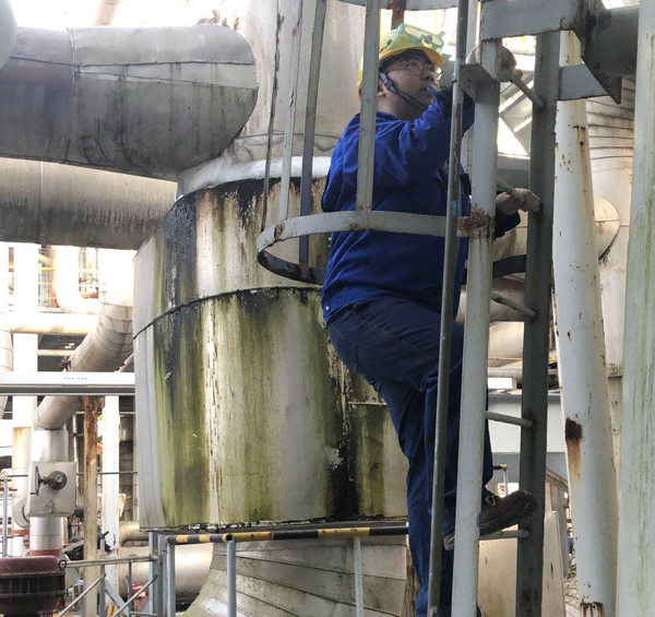 在這兩星期中的每個班、每個點,王磊都要按時按點、爬上60米的硫化氫濃縮塔C7603完成特護(hù)巡檢任務(wù)。每次回來他那淡藍(lán)色工作服上衣都會被汗浸成海水般的深藍(lán),摘下安全帽,他那引以為傲的“燙發(fā)”雜亂無章濕漉漉地緊貼在額頭上。他會先大口大口喝水,喘上幾口氣,迅速抄完報表,這時,工作服還沒有暖干,但下個點的特護(hù)巡檢時間又到了,他又趕緊防護(hù)齊全去完成特護(hù)巡檢……