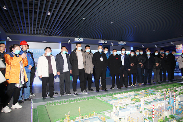 到達(dá)公司三期控制室后,雙甲車間技術(shù)人員介紹了裝置的生產(chǎn)控制及運(yùn)行情況。石軍昌就公司的大數(shù)據(jù)智能制造開(kāi)發(fā)及應(yīng)用和企業(yè)家們進(jìn)行了分享和交流。